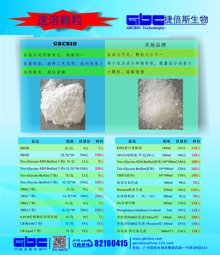 | 描述: | PBS是磷酸緩沖鹽溶液(phosphate buffer saline)一般作為溶劑,起溶解保護(hù)試劑的作用。它是生物化學(xué)研究中使用廣泛的緩沖液,主要成分為Na2HPO4、KH2PO4、NaCl和KCl,由于Na2HPO4和KH2PO4它們有二級解離,緩沖的pH值范圍很廣;而NaCl和KCl主要作用為增加鹽離子濃度。 | ||