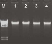 | 從<100mg新鮮(50mg干燥)植物組織中提取DNA 快速:20-50分鐘內(nèi)可以完成一次操作 可靠:獨(dú)特的緩沖系統(tǒng)能夠保證可重復(fù)性強(qiáng) 安全:無須接觸有害有機(jī)物 性價(jià)比高:操作簡單,質(zhì)量穩(wěn)定,價(jià)格低廉 產(chǎn)品原理 快速植物DNA提取試劑盒(FT Plant DNA Kit)是GBCBIO公司特色的植物DNA快速提取試劑盒,單次操作25分鐘內(nèi)完成,對各種植物樣品有效,純化的DNA可直接用于PCR、酶切和雜交等實(shí)驗(yàn)。提取過程不需要用到有毒的酚氯仿等有機(jī)物抽提,也不需要用耗時(shí)的異丙醇或乙醇沉淀,純化的基因組DNA幾乎不含有蛋白質(zhì)的污染。 實(shí)驗(yàn)結(jié)果 100mg植物組織經(jīng)FT Plant DNA Kit純化后,基因組 DNA于1.0%瓊脂糖凝膠電泳圖 M:marker 1:生菜葉 2:紅薯葉 3:草莓葉 4:水稻葉 可適用的分子生物學(xué)實(shí)驗(yàn) PCR、限制性酶切、Southern雜交等。 | ![]() |