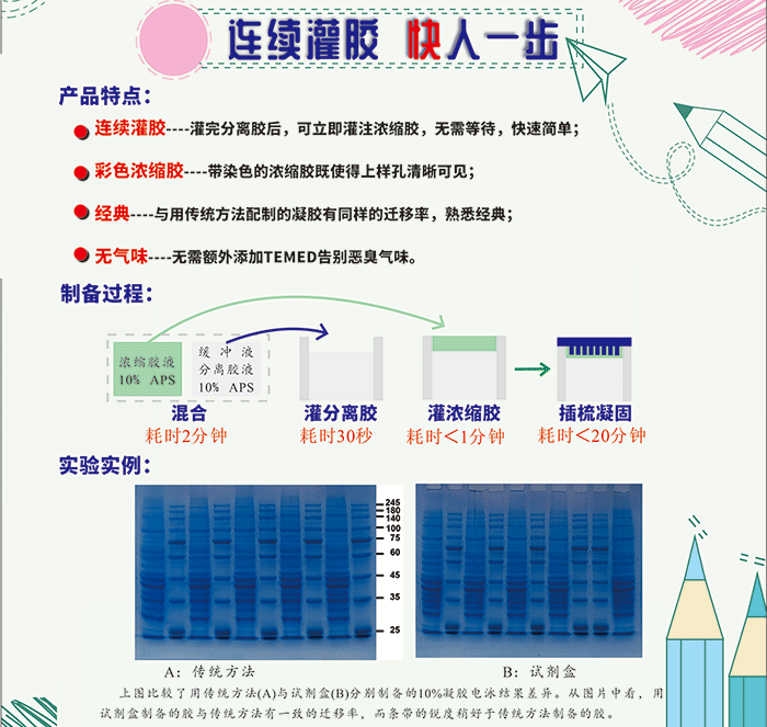 本產(chǎn)品采用上層膠和下層膠的預(yù)混配方,只需加入10% APS即可凝膠,簡(jiǎn)便快捷。下層膠與上層膠可連續(xù)灌注,時(shí)間節(jié)省一半以上。所配的上層膠可以帶有紅色,使得電泳孔清晰易辯利于上樣,該指示劑電泳結(jié)束時(shí)跑在最前端,既能監(jiān)控電泳過程,也能在轉(zhuǎn)印過程轉(zhuǎn)移到膜上,監(jiān)測(cè)轉(zhuǎn)移效率。本試劑盒灌制的凝膠也可用于非變性 PAGE 凝膠電泳。本產(chǎn)品配套提供 改良型促凝劑 ,其具有更好的穩(wěn)定性和催化效能,配膠過程中無需額外添加 TEMED。